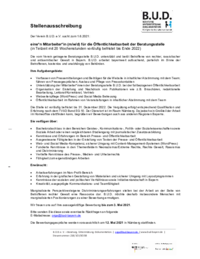 350.2021-09_Stellenausschreibung_O__A_B.U.D._e.V..pdfStellenausschreibung Der Verein B.U.D. e.V. sucht zum 1.6.2021: eine*n Mitarbeiter*in (m/w/d) für die Öffentlichkeitsarbeit der Beratungsstelle (in Teilzeit mit 20 Wochenstunden vorläufig befristet…